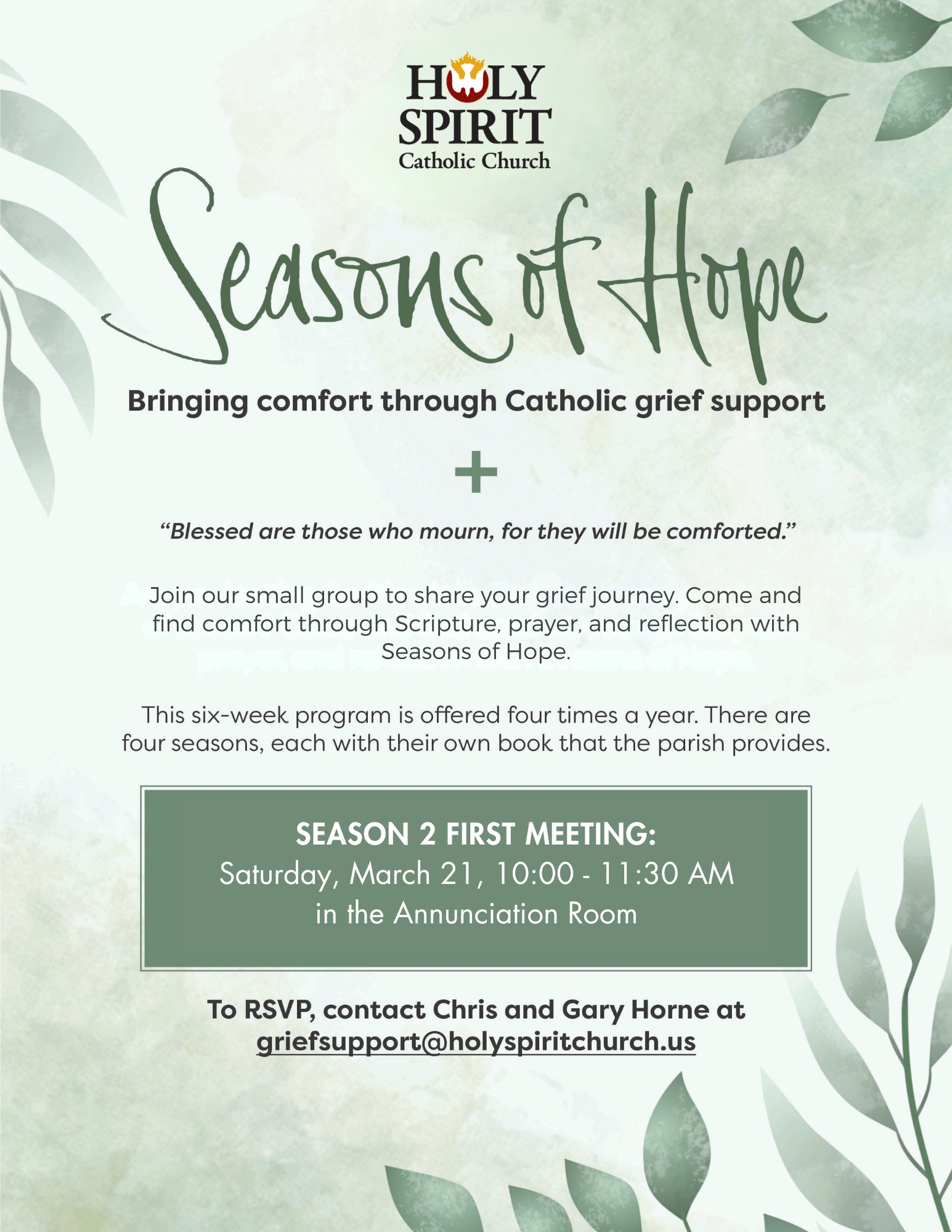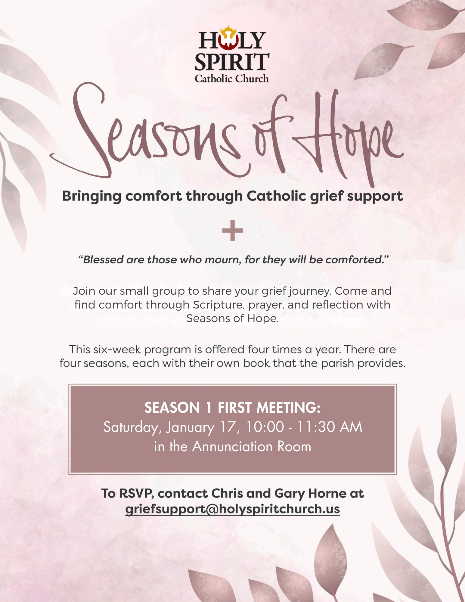 We are sorry for your loss of a loved one. No one should be alone during their grief. All parishioners are welcome to join us as we use Scripture and Catholic teaching to help with the grief process. Learn more about the spiritual and emotional support the Lord offers while among friends going through similar experiences.