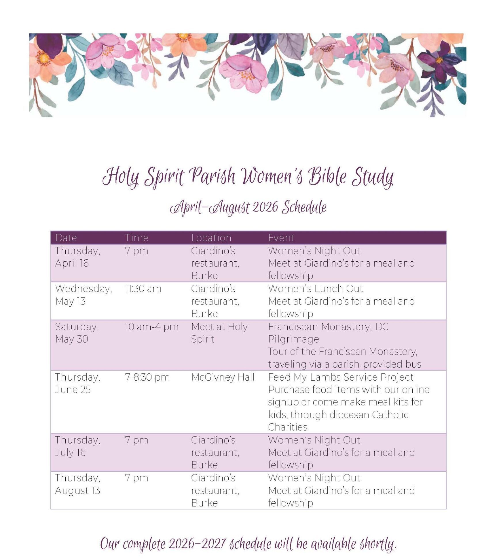 The women of the Holy Spirit Parish Women’s Bible Study invite YOU to join us as we draw closer to God through Scripture, service of others, and spending time together.