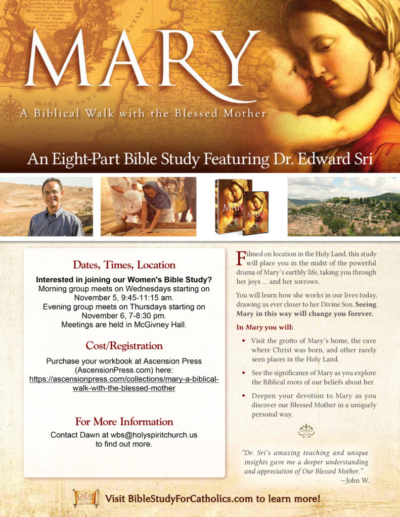 During the first week of November, we will begin an eight-week study of Mary: A Biblical Walk with the Blessed Mother. Filmed on location in the Holy Land with Dr. Edward Sri. This study reveals Mary’s unique role in God’s kingdom and our lives.