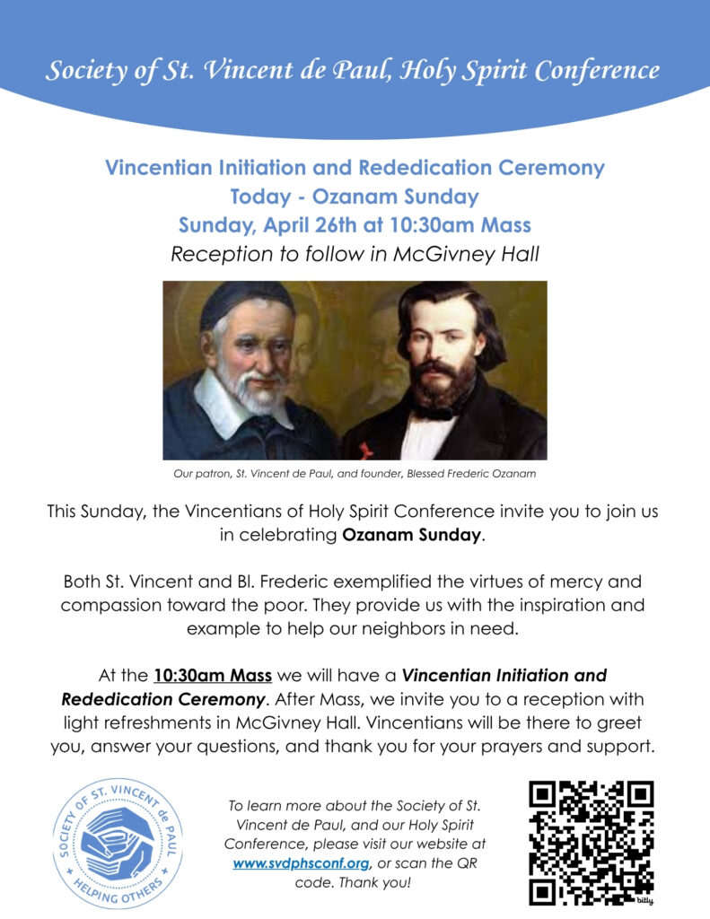 Society of St. Vincent de Paul – Ozanam Sunday Initiation and Rededication Ceremony & Reception (April 26th) Posted on April 14, 2026
