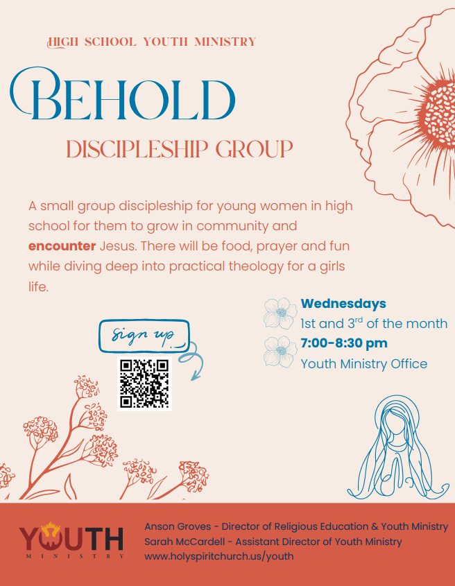 BEHOLD is inspired by Mary’s “yes” to the angel Gabriel. BEHOLD is a small group discipleship where girls can come together to discuss important topics of the faith, pray together, create new friendships and learn how to be a young Catholic woman of faith in today’s world. To register your high school girl, complete the form below. The next BEHOLD dates are on the first and third Wednesday of the month.