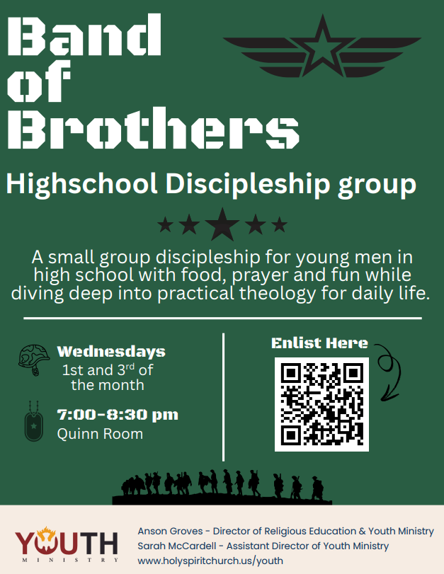 Band of Brothers is a twice-a-month guys small group discipleship for high school teens. Specifically created so our young men would have a place to come and learn what it means to be a man of God in today’s world. This group has been an incredible way for guys from all different high schools in the area to come together to discuss topics of practical theology, pray together and have a lot of fun! To register your high school boy, complete the form below. The next BAND OF BROTHERS dates are on the first and third Wednesday of the month.