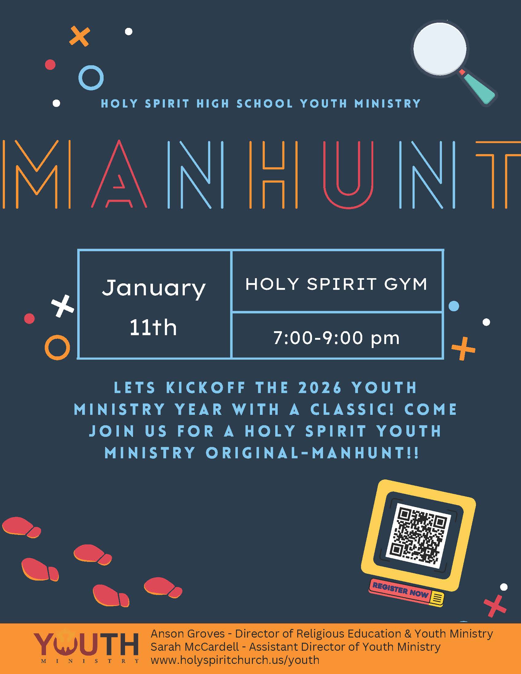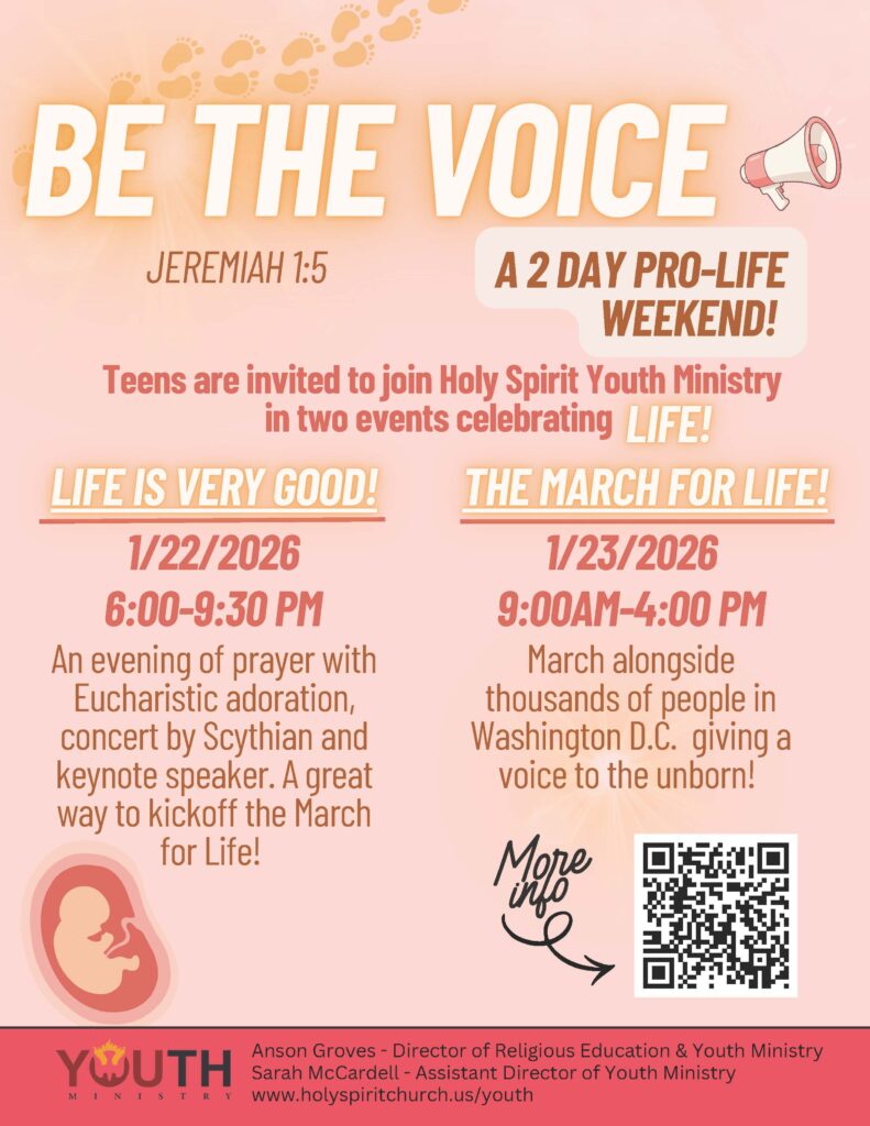 Join Holy Spirit’s High School Youth Ministry for the Life is VERY Good Evening of Prayer and National March for Life in Washington D.C. on January 22nd & January 23rd! More information and registration here.