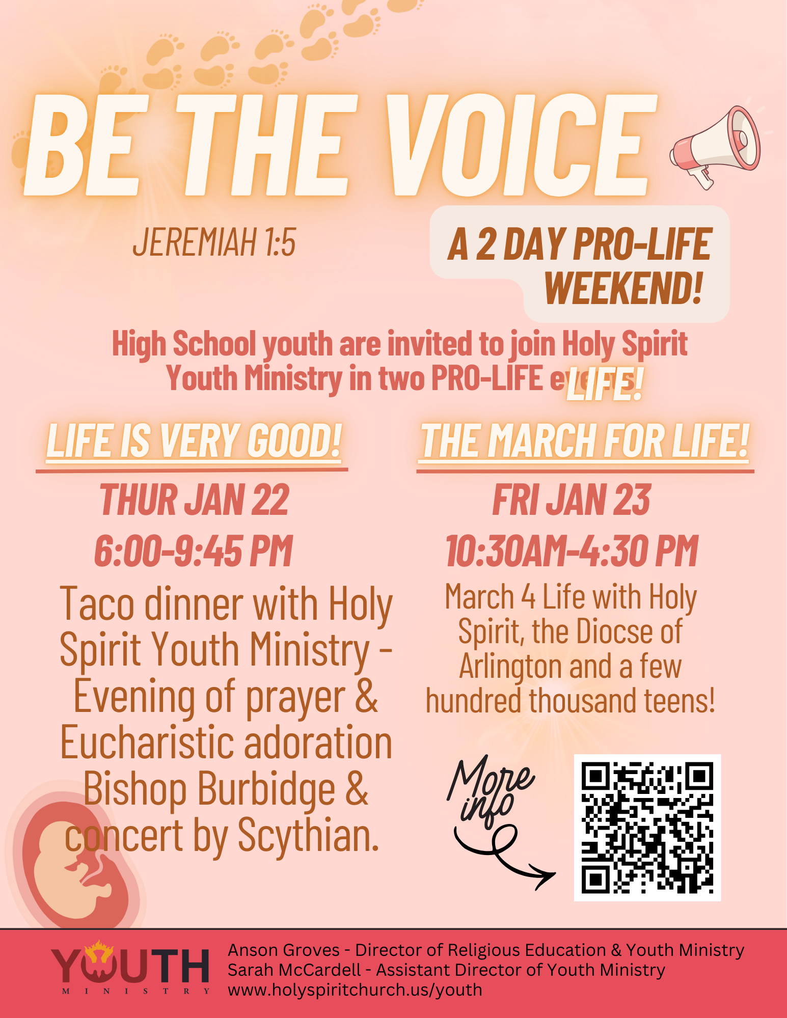 Join Holy Spirit’s High School Youth Ministry for the Life is VERY Good Evening of Prayer and National March for Life in Washington D.C.!