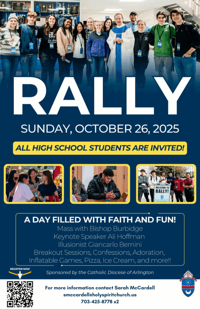 Bishop Burbidge invites all teens of the Diocese to join him at RALLY 2025! This annual event typically held in October is an opportunity for the young Church in the Diocese of Arlington to gather each year to pray, learn, and celebrate the Catholic faith. Learn more here.