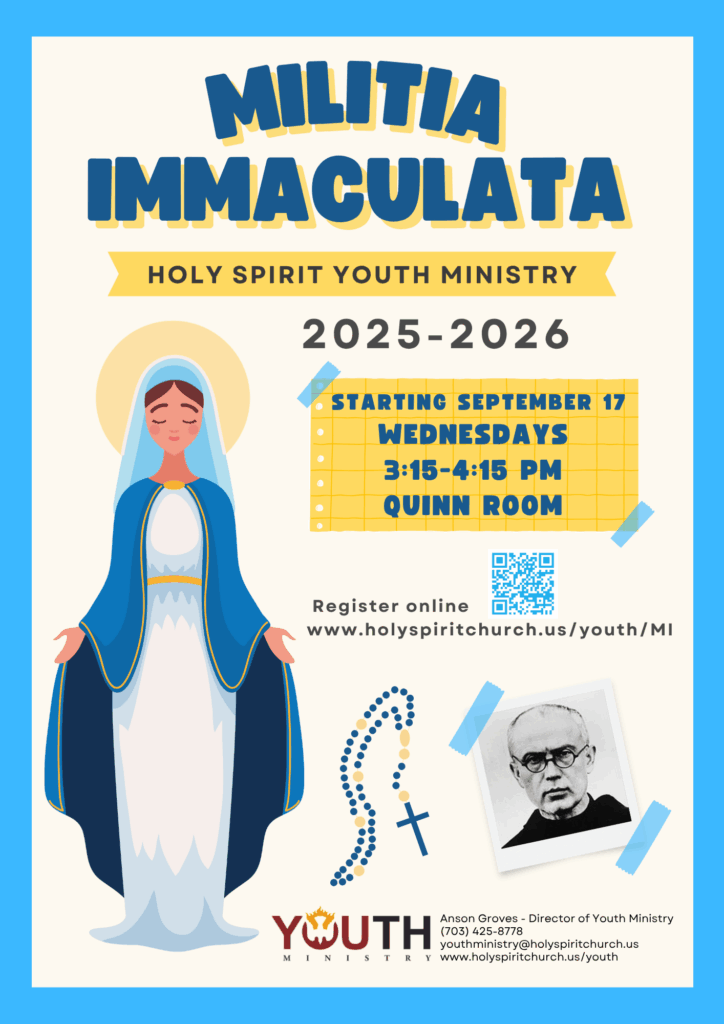 What is it? It is a prayer group using the power of the youth to pray for the world. We meet every week to call upon the Holy Spirit through the intercession of Holy Mother of God, Our Lady, the Virgin Mary. The Militia Immaculata is a spiritual movement founded by St. Maxamillian Kolbe with the aim to convert souls and bring peace to the world. During Militia Immaculata the children gather to pray the Holy Rosary, asking for specific personal prayer intentions. The children usually ask all those in MI to pray for their family. Parents and siblings are most frequently the prayer intention of the children . . . when they come to MI, they are usually praying for you!